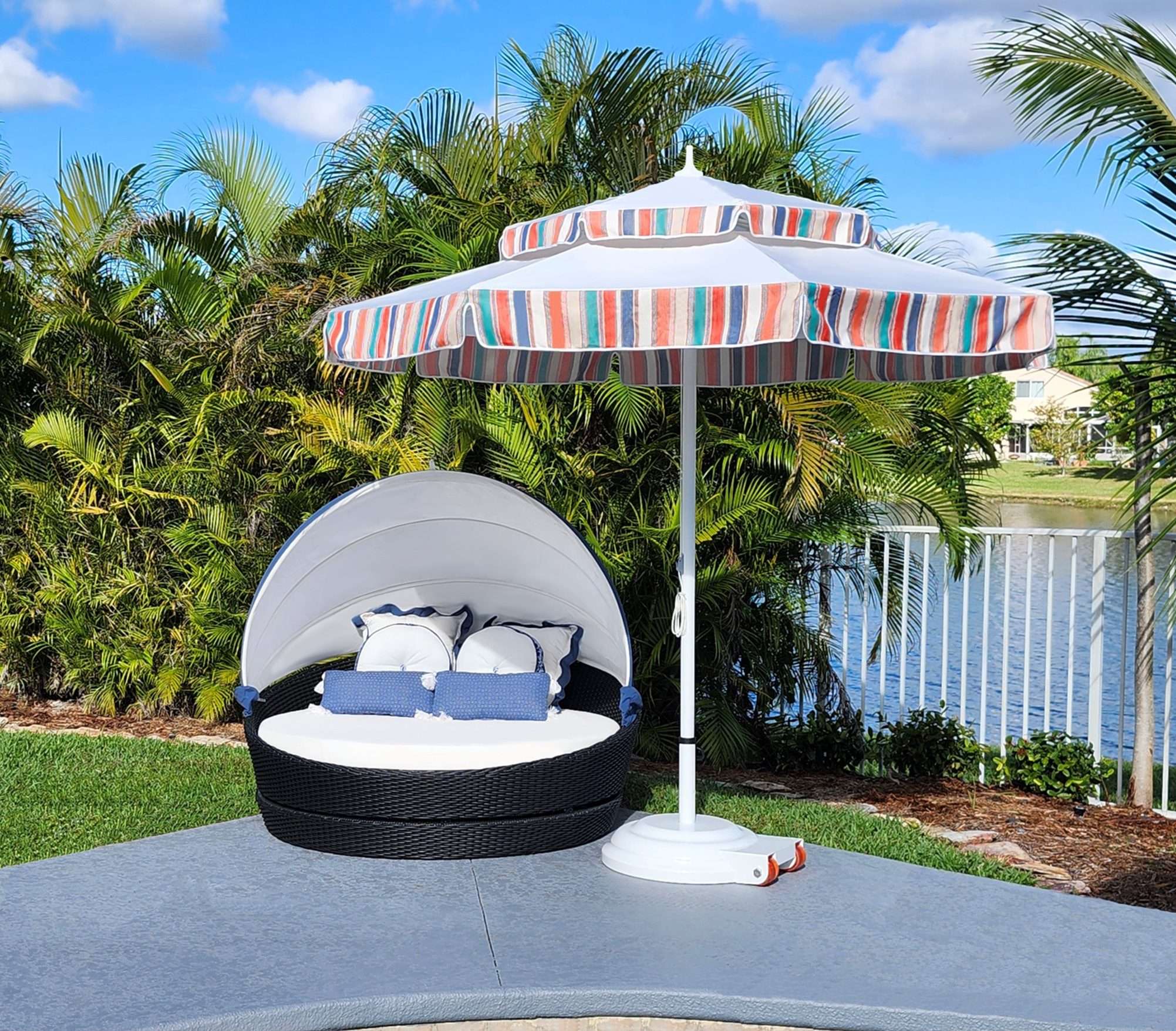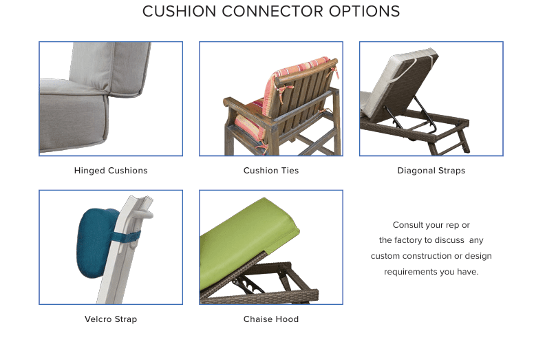 Additional accessories include headrests and bolster or lumbar pillows, which add targeted comfort and ergonomic support. The headrest features a Velcro closure with adjustable straps, allowing it to fit securely on most chairs. Lumbar and bolster pillows are shaped to support the lower back, enhancing relaxation while adding a pop of color and design. Each piece is made with both durability and comfort in mind, making them ideal accents for hospitality, resort, and residential environments.